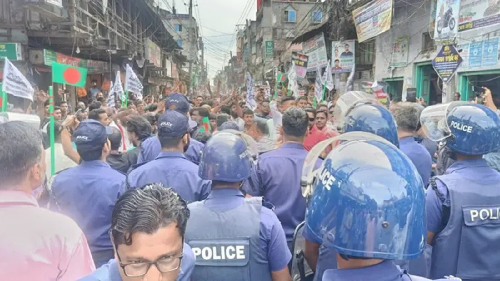 Meanwhile, BNP activists had been holding a separate gathering in front of their district office at Mahajanpotti since the morning. At around 12:30 p.m., thousands of BNP supporters marched towards Notunbazar and reached the Press Club area, where they came face-to-face with BJP activists.